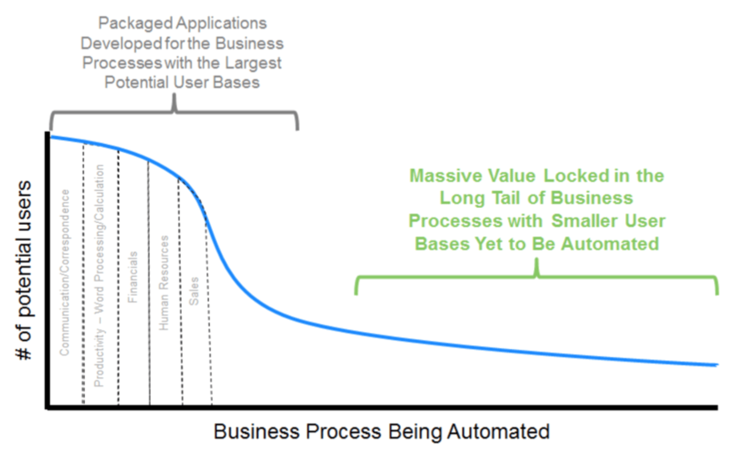 About ten years ago, Morgan Stanley published a research paper on “the next $100 billion software company.” It’s been so long that I can’t even find the original paper to link to, but I remember one of its core ideas very clearly: there’s a long tail of businesses with limited user bases that haven’t yet been automated by packaged applications.